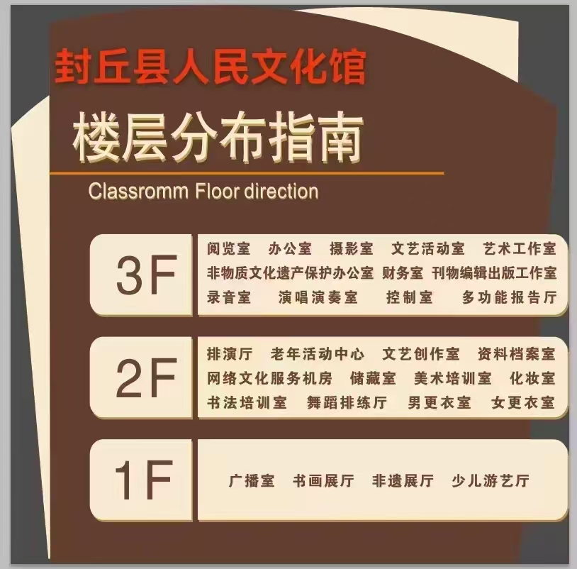 封丘县人民文化馆现为国家一级馆,共有三层,总建筑面积4785㎡,一楼为展览性用房,设少儿游艺室、书画展厅、非遗展厅;二楼为功能性用房,设书法培训室、美术培训室、舞蹈排练厅、排演厅、计算机网络教室、艺术工作室等;三楼为演唱演奏室、阅览室等。封丘县人民文化馆开馆时间:周一至周五,上午8:30--12:00 下午14:30--17:30