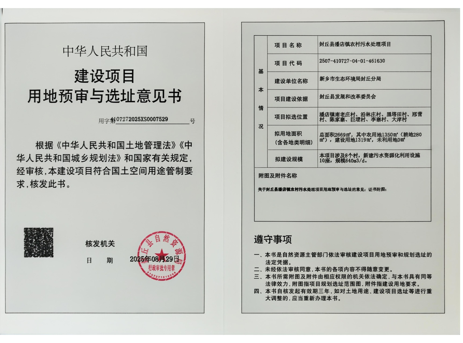 封丘县潘店镇农村污水处理项目用地预审与选址意见书