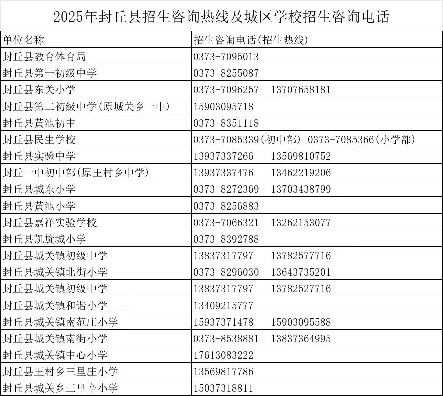 为做好2025年封丘县义务教育阶段学校招生工作,按照《河南省教育厅办公室关于做好2025年义务教育阳光招生工作的通知》(教办基〔2025〕104号)、《2025年新乡市区义务教育阶段学校招生工作方案》(新教〔2025〕19号)等文件要求,结合本县实际制定本方案。