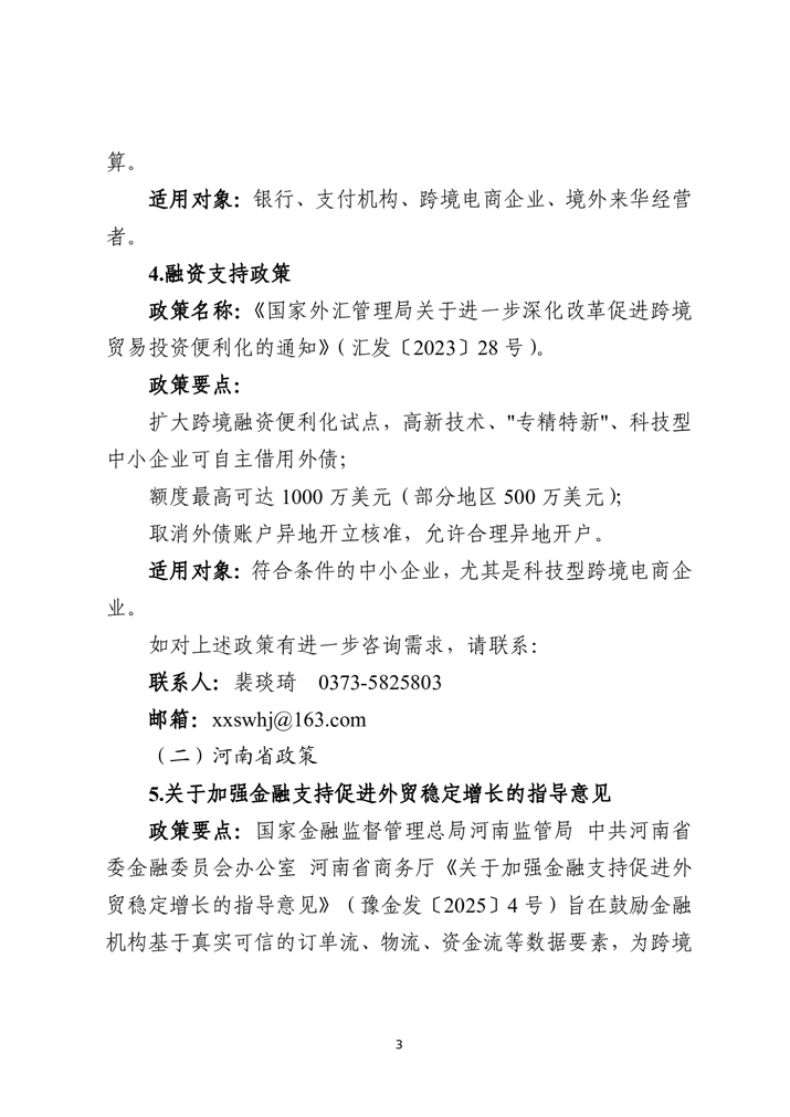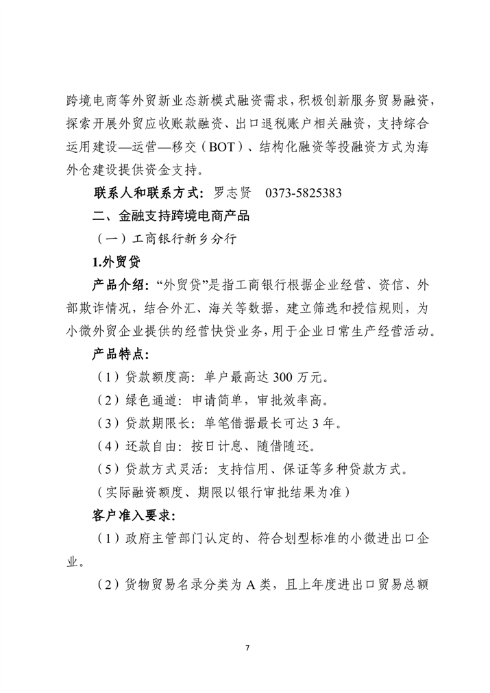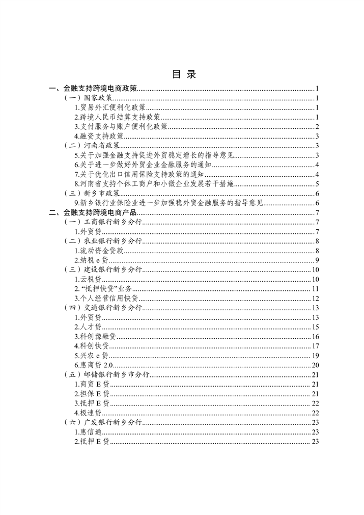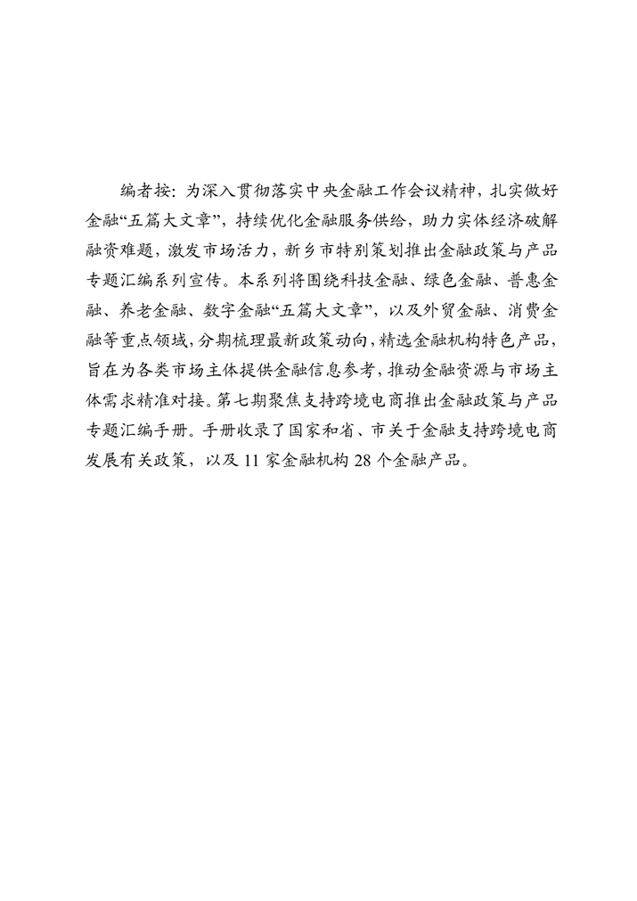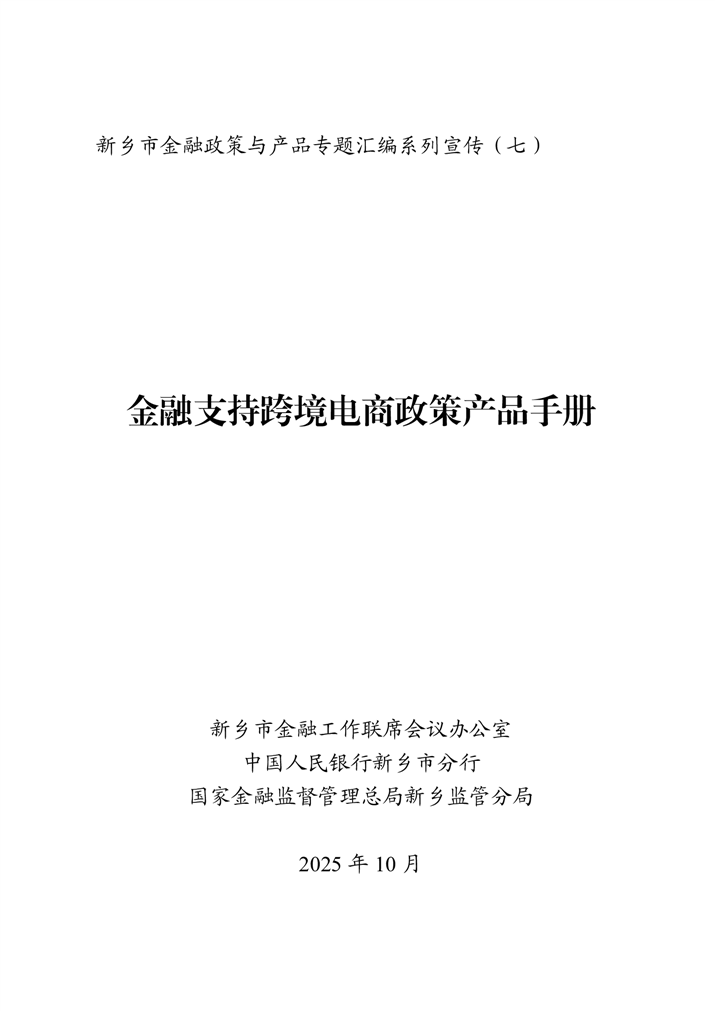 为深入贯彻落实中央金融工作会议精神,扎实做好金融“五篇大文章”,持续优化金融服务供给,助力实体经济破解融资难题、激发市场活力,新乡市特别策划推出金融政策与产品专题汇编系列宣传。本系列将围绕科技金融、绿色金融、普惠金融、养老金融、数字金融“五篇大文章”,以及外贸金融、消费金融等重点领域,分期梳理最新政策动向,精选金融机构特色产品,旨在为各类市场主体提供金融信息参考,推动金融资源与市场主体需求精准对接。第七期聚焦支持跨境电商推出金融政策与产品专题汇编手册。手册收录了国家和省、市关于金融支持跨境电商发展有关政策,以及11家金融机构28个金融产品。