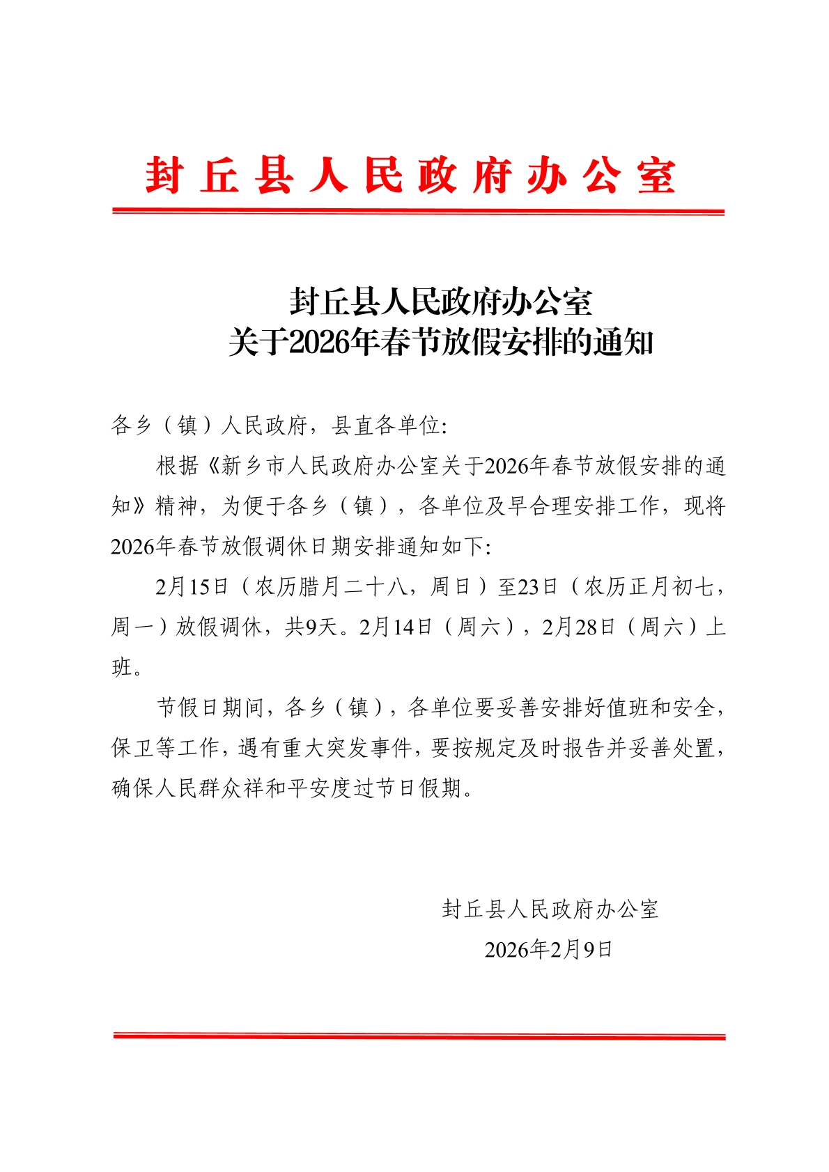 封丘县人民政府办公室关于2026年春节放假安排的通知