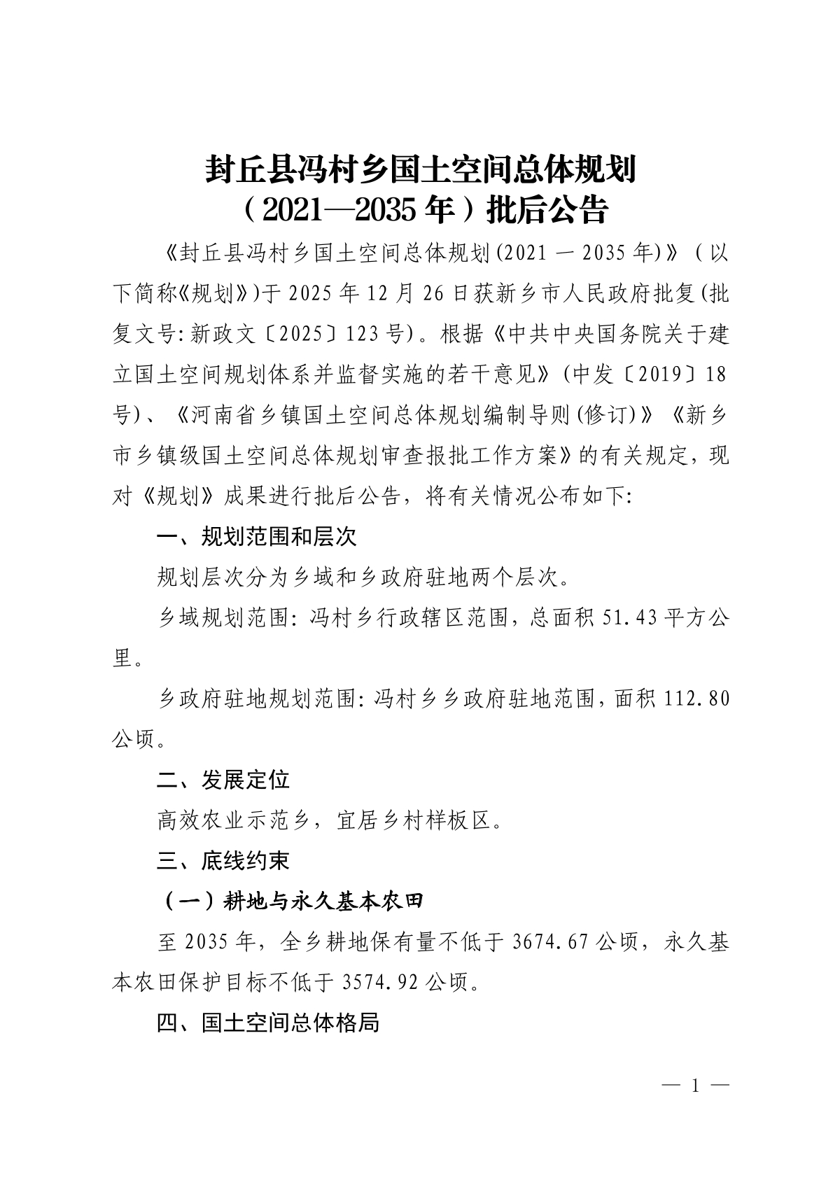 封丘县冯村乡国土空间总体规划(2021—2035年)批后公告