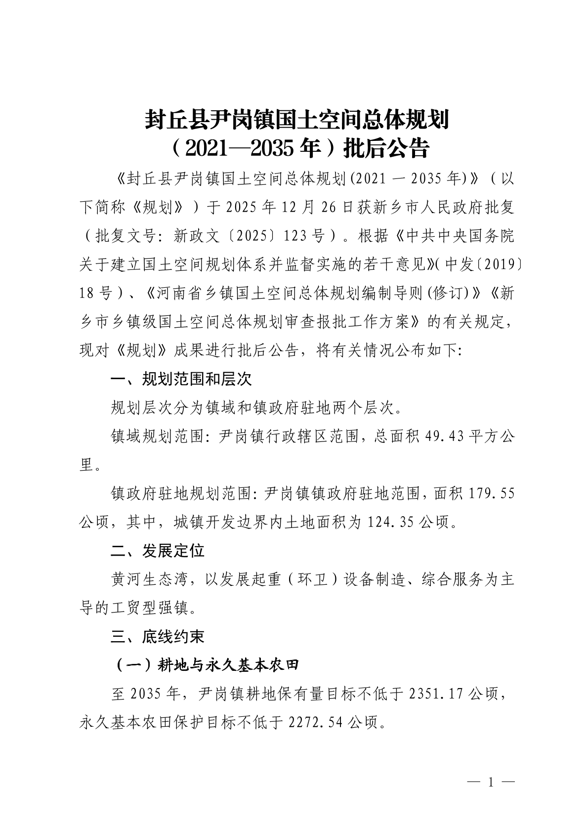 封丘县尹岗镇国土空间总体规划(2021—2035年)批后公告