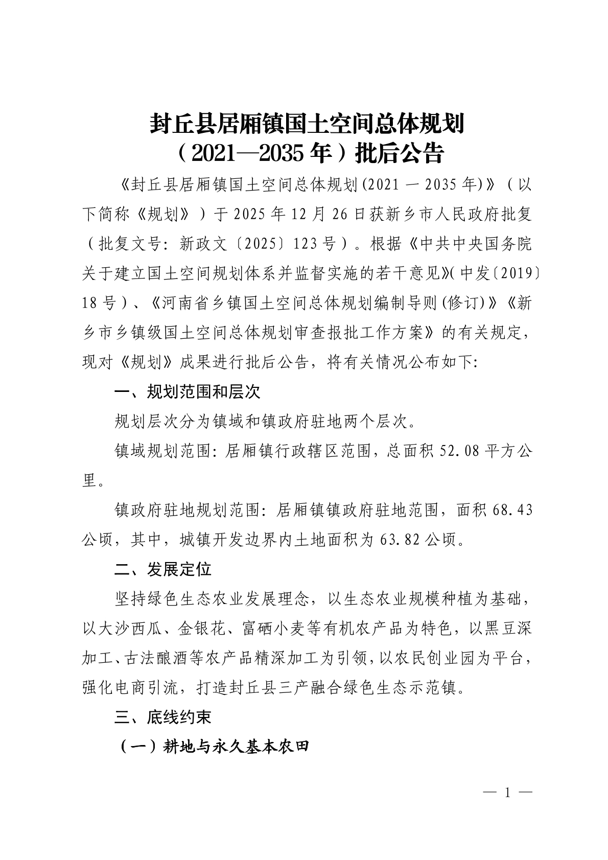 封丘县居厢镇国土空间总体规划(2021—2035年)批后公告